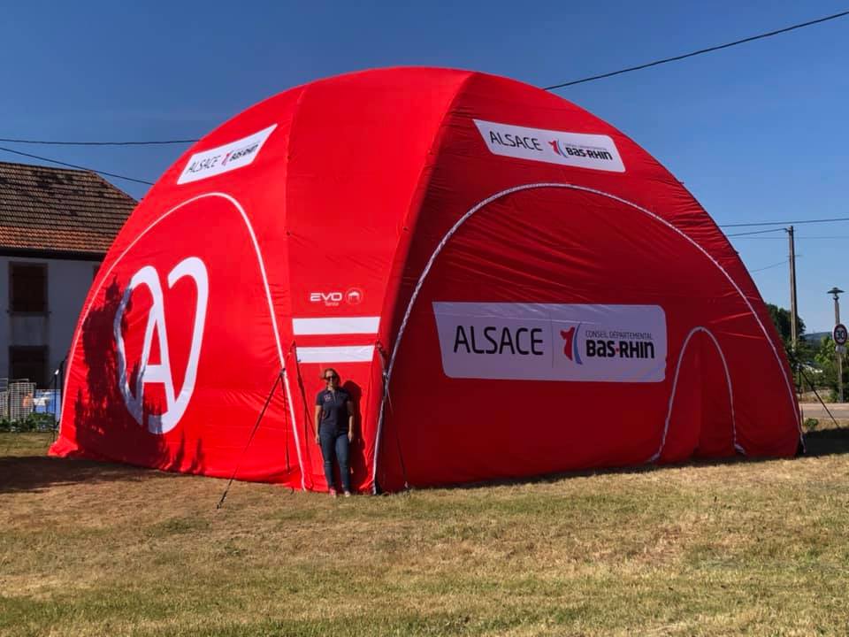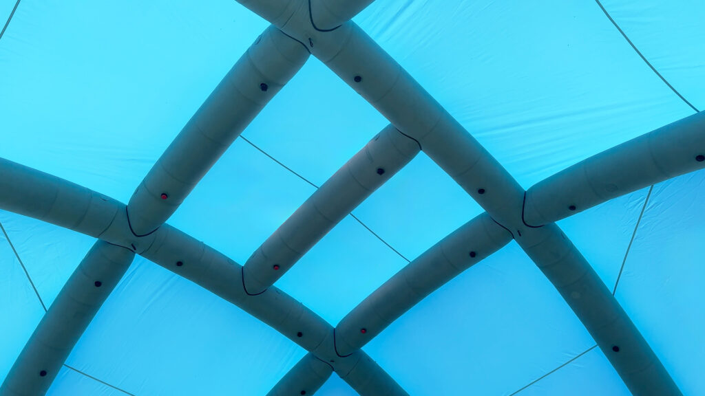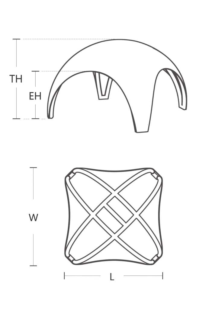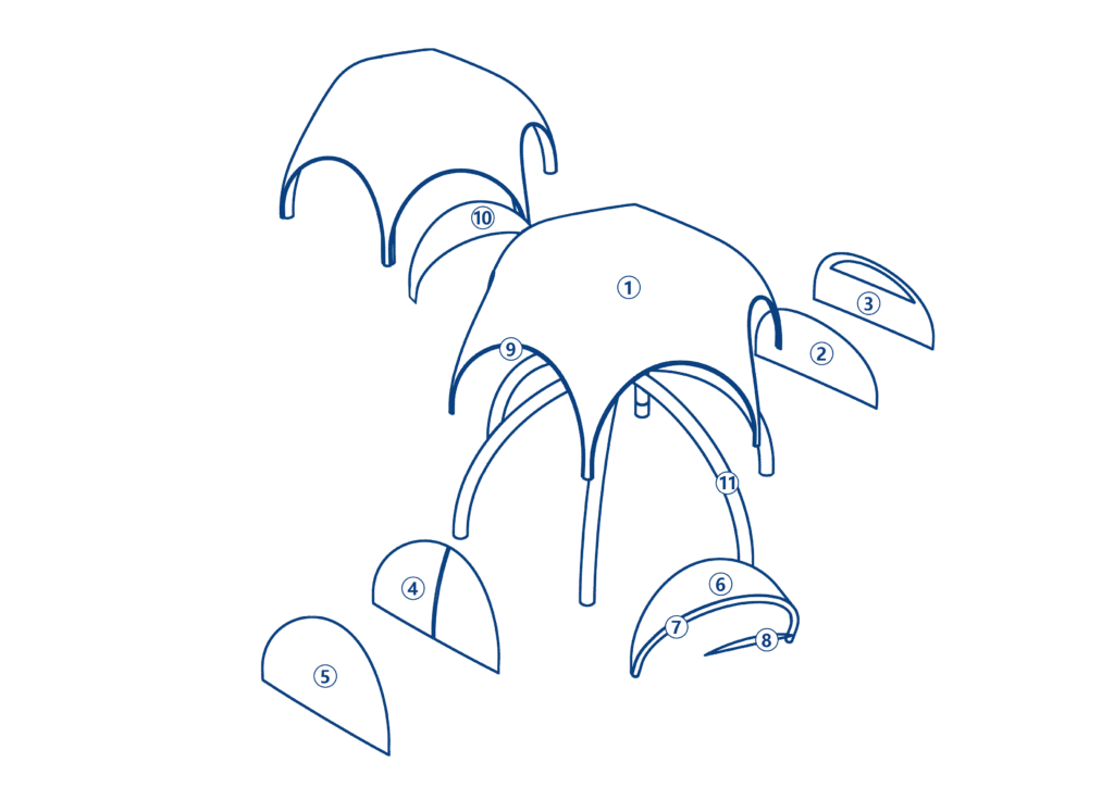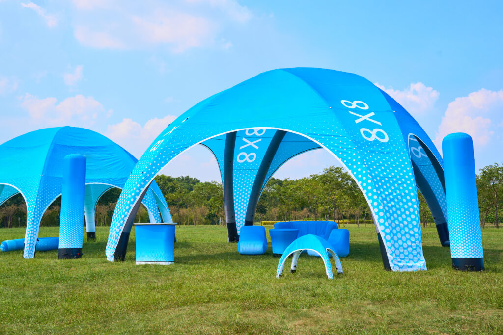 The modular design allows quick replacement of canopy tops, leg covers, and bladders, extending product life and reducing costs. Multiple tents can be connected for even larger event spaces.